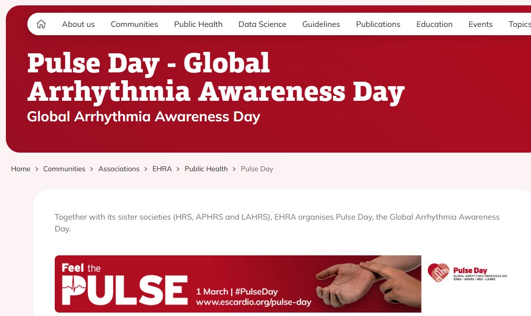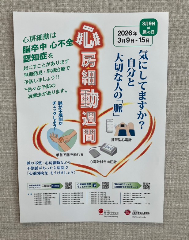 毎年恒例となりますが、日本不整脈心電学会から「脈の日」「心房細動週間」のポスターを頂きましたのでクリニック内に掲示いたしました。日本脳卒中協会と日本不整脈心電学会は、3月9日の「脈の日」から1週間を「心房細動週間」と提唱し、脳卒中・心房細動に関する正しい知識の普及を目標に掲げています。なお海外では、3人に1人が生涯のうちに重篤な不整脈を発症するリスクがあることから本日3月1日をPulse Dayとして、日本でいう「脈の日」と同様に不整脈への注意を呼びかける啓発活動が行われています。